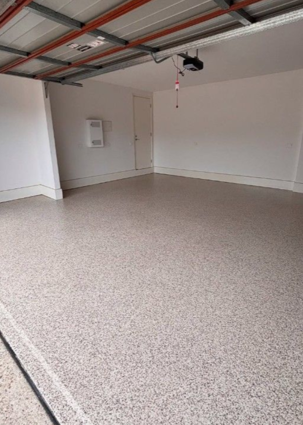 A smooth epoxy floor can be slippery. However, our Flake System inherently adds texture/grip. For pool decks or steep driveways, we can add an additional non-slip aggregate (aluminum oxide) to the topcoat to ensure safety without compromising cleanability.