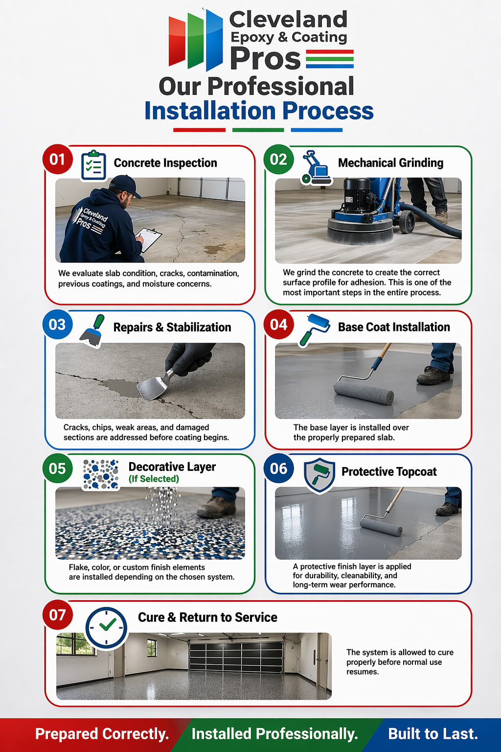 Cleveland Epoxy & Coating Pros is a Cleveland-area concrete coating contractor specializing in residential, commercial, and industrial epoxy flooring systems across Parma and Northeast Ohio. Our work focuses on long-term concrete protection, proper mechanical preparation, and high-performance coatings built for Ohio conditions.